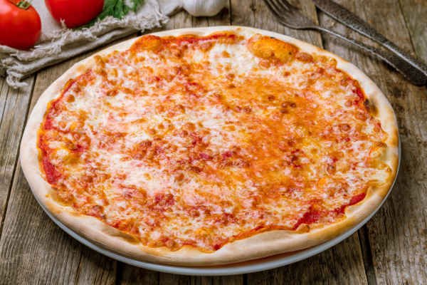 Cheese pizzas consist of a round circle of dough topped with tomato sauce and mozzarella and parmesan cheese, served hot.