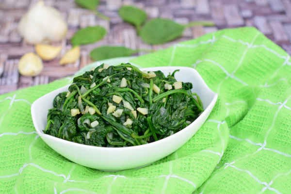 Spinach with garlic and oil is a dish of fresh spinach sautéed with garlic and oil. Served hot.